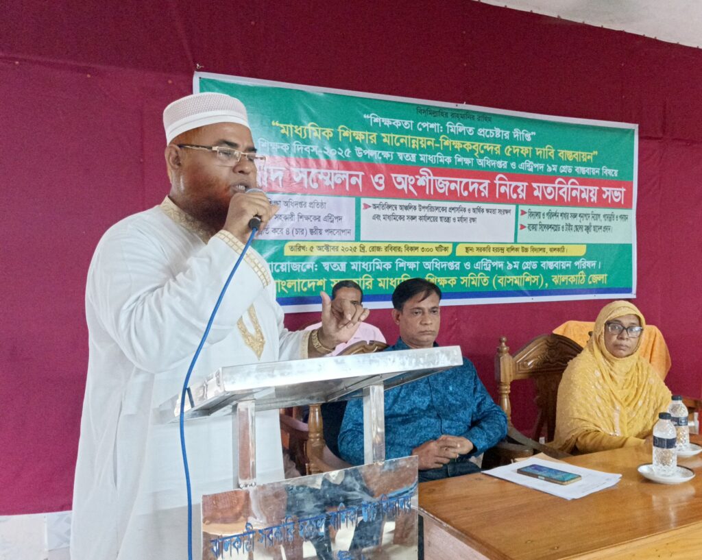 ‎৫ অক্টোবর বিকেল ৪টায় সরকারি হরচন্দ্র বালিকা উচ্চ বিদ্যালয়ের হলরুমে  বাংলাদেশ সরকারি মাধ্যমিক শিক্ষক সমিতি (বাসমাশিস) ঝালকাঠি জেলা শাখার আয়োজনে অনুষ্ঠিত এক সভায় শিক্ষকরা এ কথা বলেন। বক্তারা আরও বলেন, সরকারি মাধ্যমিক বিদ্যালয়ের প্রায় ১৫ হাজার শিক্ষক-কর্মকর্তার বিপরীতে পদোন্নতিযোগ্য পদ মাত্র চার শতাংশ। এর ফলে ৩২-৩৩ বছর চাকরি করেও অধিকাংশ শিক্ষক পদোন্নতিn ছাড়া অবসরে যাচ্ছেন। তাঁরা বলেন, প্রশাসনিক বৈষম্য, বকেয়া টাইমস্কেল, সিলেকশন গ্রেড, পদায়ন ও পদোন্নতির জটিলতা দূর করা উচিত।