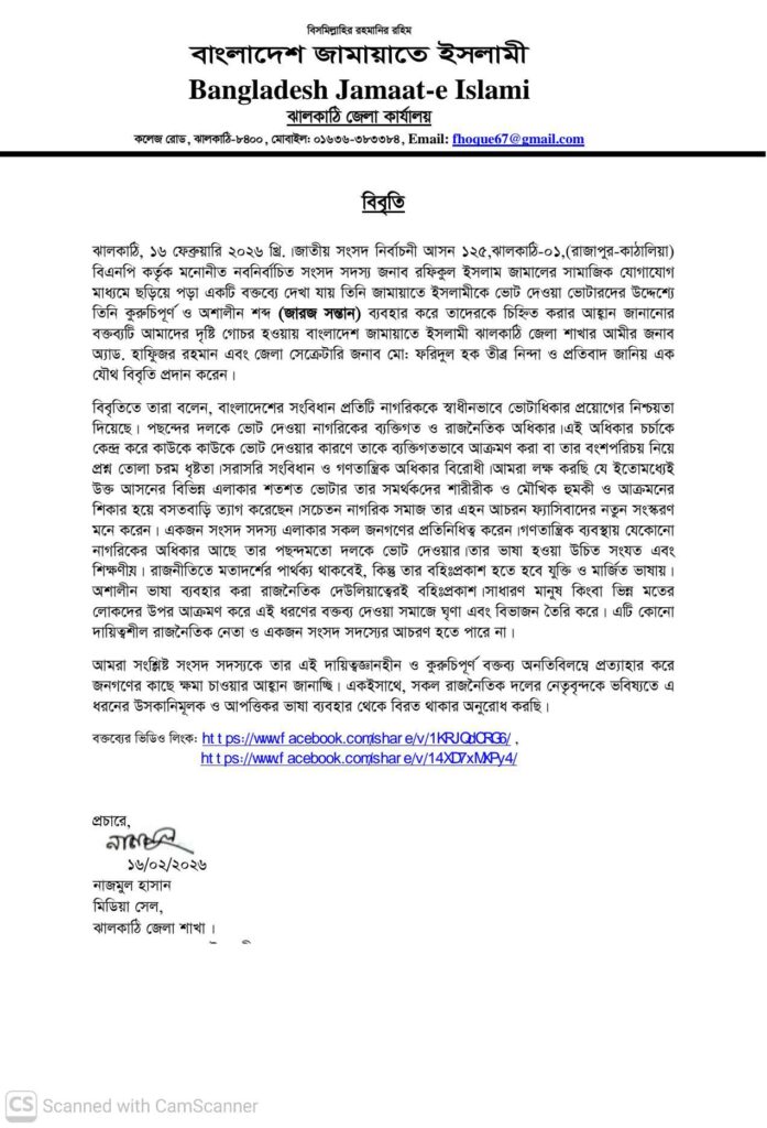 ঝালকাঠি-১ (রাজাপুর-কাঠালিয়া) আসনের নবনির্বাচিত সংসদ সদস্য রফিকুল ইসলাম জামালের একটি বক্তব্য ঘিরে রাজনৈতিক অঙ্গনে বিতর্ক সৃষ্টি হয়েছে। সামাজিক যোগাযোগমাধ্যমে ছড়িয়ে পড়া একটি ভিডিওতে তাকে জামায়াতে ইসলামীকে ভোট দেওয়া ভোটারদের উদ্দেশ্যে কুরুচিপূর্ণ (জারজ সন্তান) মন্তব্য করতে দেখা যায়। এ ঘটনায় তীব্র নিন্দা ও প্রতিবাদ জানিয়েছে বাংলাদেশ জামায়াতে ইসলামী ঝালকাঠি জেলা শাখা।