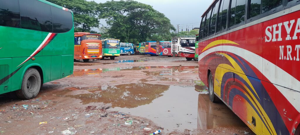 খানাখন্দে ভরা ঝালকাঠি বাসস্ট্যান্ড যাত্রী ছাউনি টয়লেট সংকটে চরম ভোগান্তি যাত্রীদের